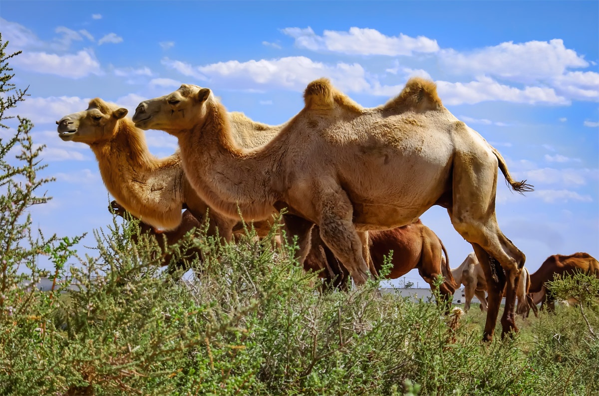 骆驼,被称为“沙漠之舟”,头较小,颈粗长,弯曲如鹅颈。躯体高大,体毛褐色。极能忍饥耐渴。骆驼可以在没有水的条件下生存2周,没有食物可生存一个月之久。驼峰里贮存着脂肪,可在得不到食物时,分解成身体所需养分,供骆驼生存需要。另外,骆驼的胃里有许多瓶子形状的小泡泡,用来贮存水。骆驼可用作骑乘、驮运、拉车、犁地等,是沙漠戈壁地区人民和地质勘探、考古工作者不可缺少的伙伴。单峰驼主要分布于苏丹,索马里,印度等国;双峰驼近一半分布于澳大利亚,中国主要分布于新疆、甘肃、内蒙。
