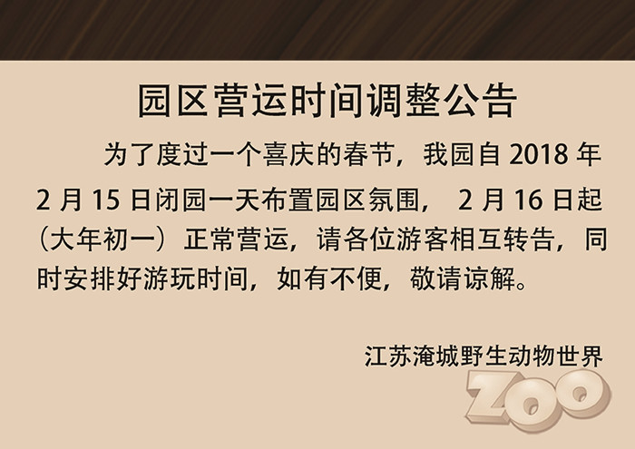 为了打造一场充满年味的春节盛宴,我园自2018年2月15日闭园一天布置园区氛围,2月16日起(大年初一)正常营运,请各位游客相互转告,同时安排好游玩时间,如有不便,敬请谅解!