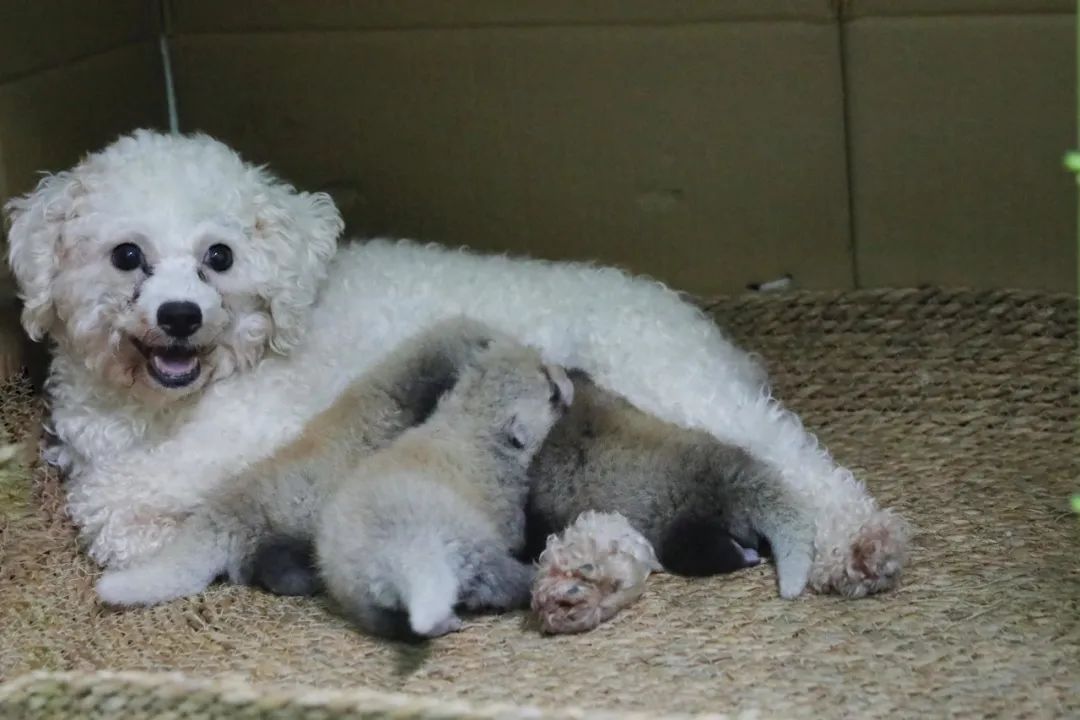 罕见小小熊猫三胞胎,“狗奶妈”贴心带娃!